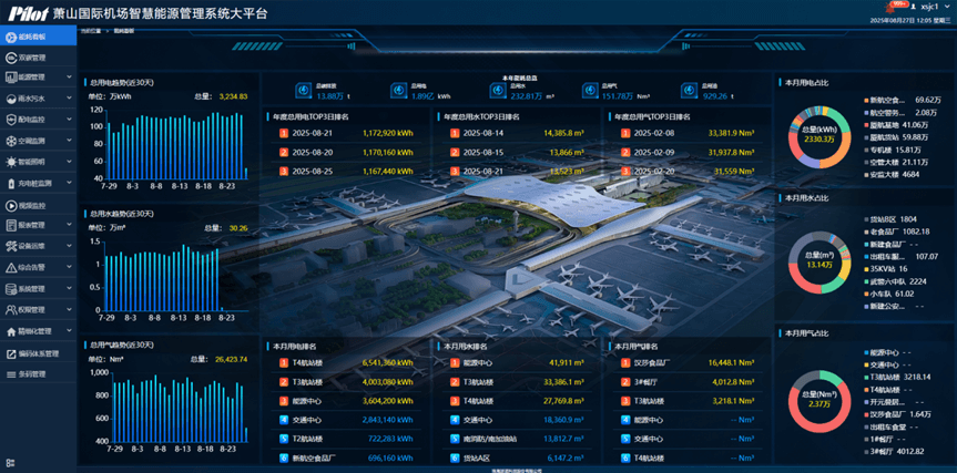 “双碳”管理、配电监控、智能照明……在杭州机场智慧能源管理大平台上,各项数据一目了然。该平台基于信息和通信技术,建立感知体系与数据体系双轮驱动模式,实现能碳管理、安全生产及应急响应的智能化管控。通过24小时不间断监测、每15分钟自动采集数据,平台可自动发现异常并告警,大幅提高管理效能,实现年节水约32万吨、节电90万千瓦时、节气1.5万方,节省能耗支出约213万元。杭州机场成为国内继上海浦东机场、昆明长水机场之后,第三个通过碳管理体系认证的机场。